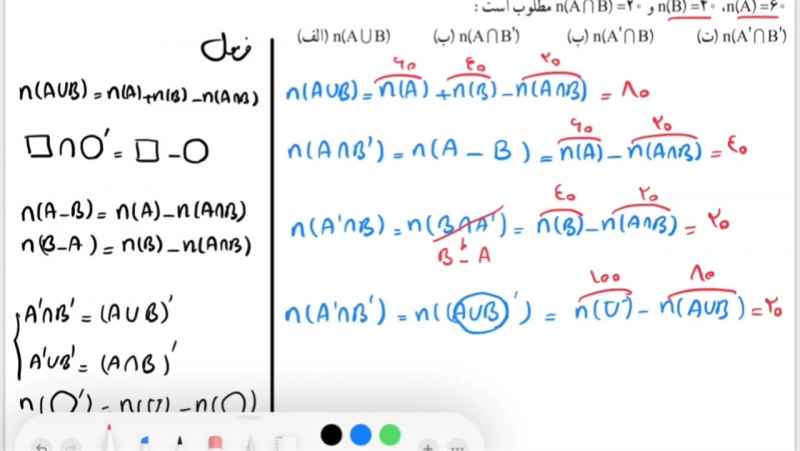 در این بخش راجع به تعداد اعضای مجموعه صحبت می‌‎کنیم که به دو روش حل میشود: جبر مجموعه (که روش خوبی نیست چونکه برای حل سوالاتش باید فرمول حفظ کنیم.) نمودار ون (که این روش پیشنهادی ما هست؛ چون نیاز به فرمول نداره و برای همین راحت‌تره) خوشحال میشیم اگه از ویدئو خوشتون اومد و بدردتون خورد، لایک کنید مارو.️️️️️ اگه سوالی براتون پیش اومده در قسمت نظرات مطرح کنین تا با کمال میل پاسخ بدیم.️ کانال ما رو دنبال کنید تا ویدئو های بعدی رو از دست ندید. برای دیدن ویدئو های بیشتر به سایت آموزش ریاضی تصاعد سر بزنید.