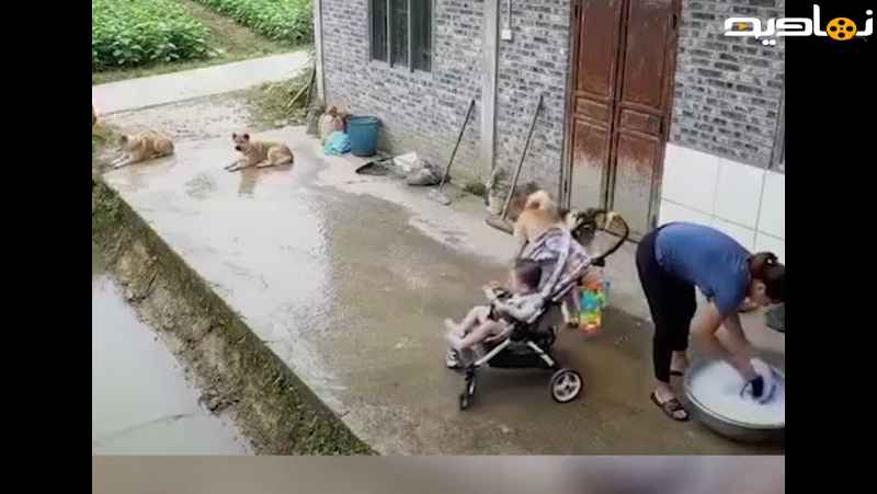 نجات کودک سوار بر کالسکه از سقوط توسط یک سگ